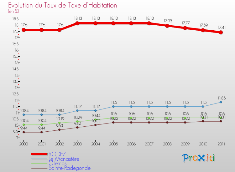 En 2011, le taux de la taxe d'habitation vôté par le conseil municipal de Rodez était de : 17.41 %.