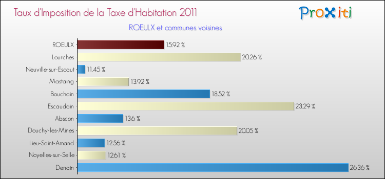 En 2011, le taux de la taxe d'habitation vôté par le conseil municipal de Roeulx était de : 15.92 %.