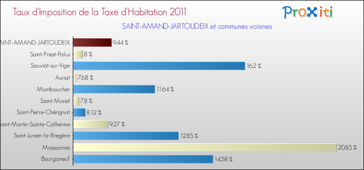 Vous trouverez ci-dessous des graphiques qui vous permettent de situer le taux de la taxe d'habitation de Saint-Amand-Jartoudeix par rapport aux communes voisines.