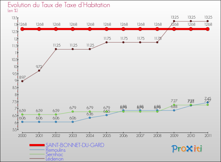 En 2011, le taux de la taxe d'habitation vôté par le conseil municipal de Saint-Bonnet-du-Gard était de : 12.68 %.