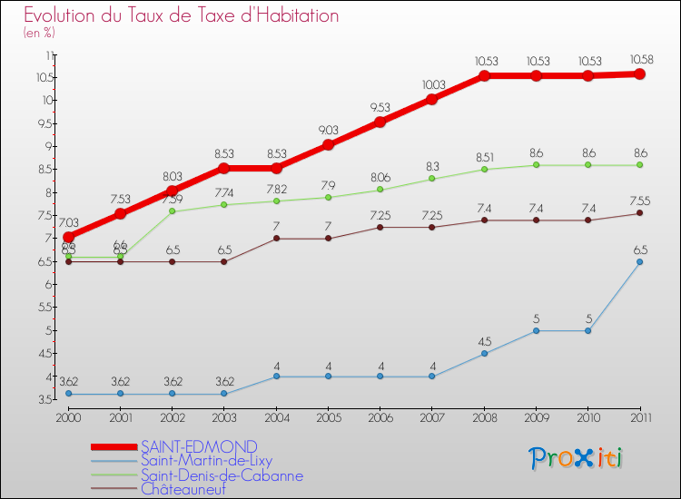 Pendant la même période, les communes françaises similaires à Saint-Edmond, ont vu leur taux de taxe d'imposition augmenter de 30.79 % en moyenne entre 2000 et 2011.