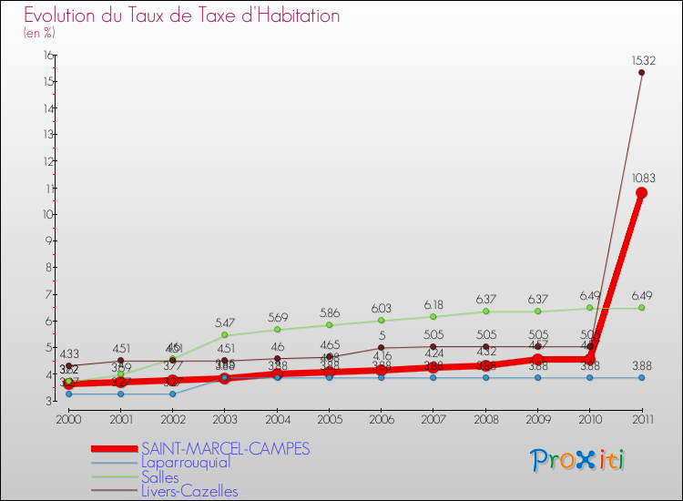 Le graphique ci dessous représente l'évolution du taux de la taxe d'habitation à Saint-Marcel-Campes depuis 2000.