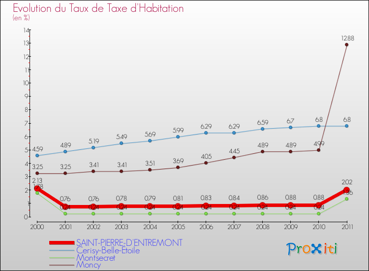 Pendant la même période, les communes françaises similaires à Saint-Pierre-d'Entremont, ont vu leur taux de taxe d'imposition augmenter de 0.56 % en moyenne entre 2000 et 2010.