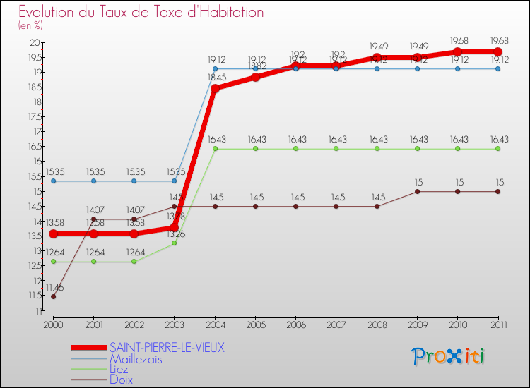 Pendant la même période, les communes françaises similaires à Saint-Pierre-le-Vieux, ont vu leur taux de taxe d'imposition augmenter de 27.53 % en moyenne entre 2000 et 2011.