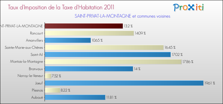 En 2011, le taux de la taxe d'habitation vôté par le conseil municipal de Saint-Privat-la-Montagne était de : 13.2 %.