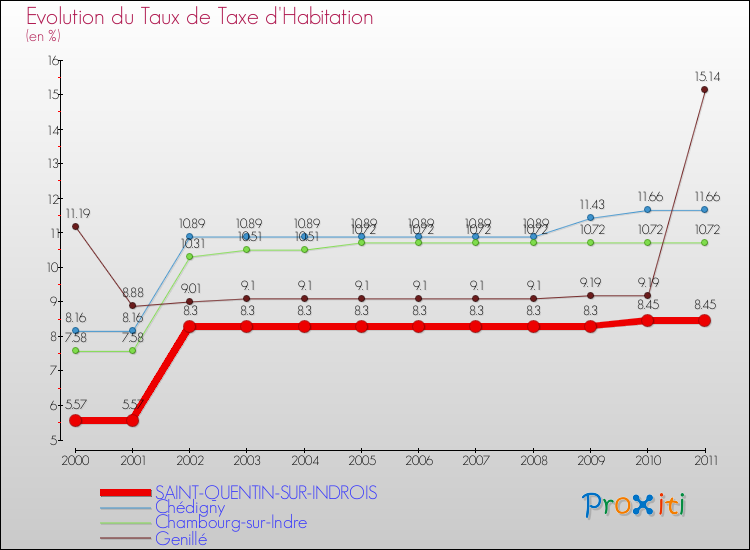 Le graphique ci dessous représente l'évolution du taux de la taxe d'habitation à Saint-Quentin-sur-Indrois depuis 2000.