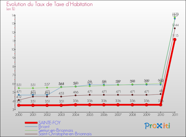 Pendant la même période, les communes françaises similaires à Sainte-Foy, ont vu leur taux de taxe d'imposition augmenter de 4.32 % en moyenne entre 2000 et 2010.