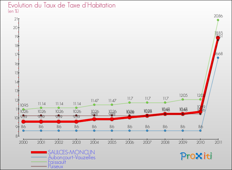 A Saulces-Monclin, le taux de taxe d'imposition a ainsi augmenté de 11.47 % entre 2000 et 2010.