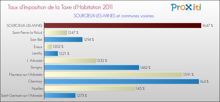 En 2011, le taux de la taxe d'habitation vôté par le conseil municipal de Sourcieux-les-Mines était de : 16.47 %.