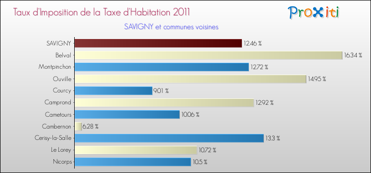 En 2011, le taux de la taxe d'habitation vôté par le conseil municipal de Savigny était de : 12.46 %.
