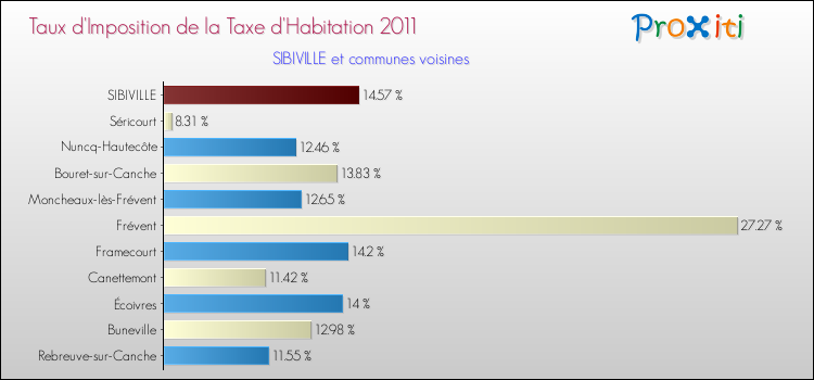 En 2011, le taux de la taxe d'habitation vôté par le conseil municipal de Sibiville était de : 14.57 %.