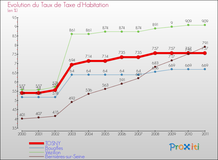 En 2011, le taux de la taxe d'habitation vôté par le conseil municipal de Tosny était de : 7.57 %.