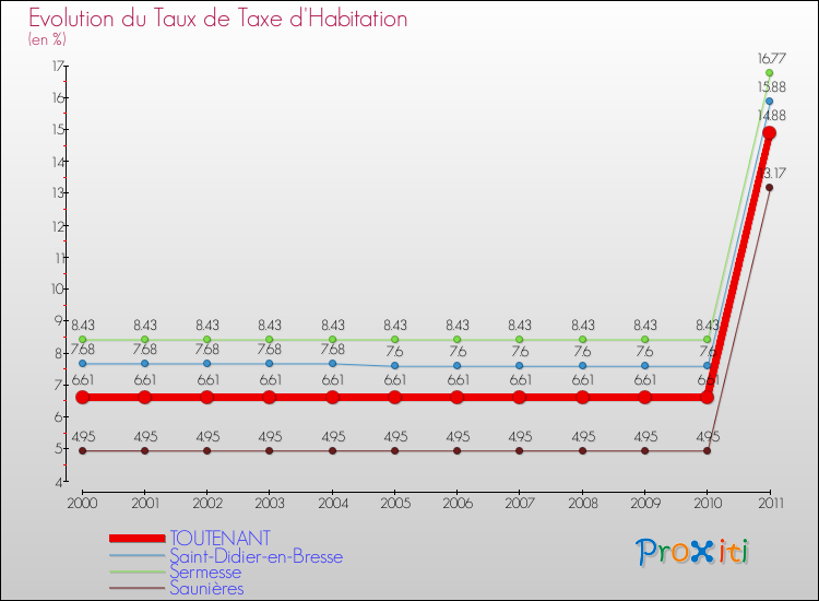 Le graphique ci dessous représente l'évolution du taux de la taxe d'habitation à Toutenant depuis 2000.