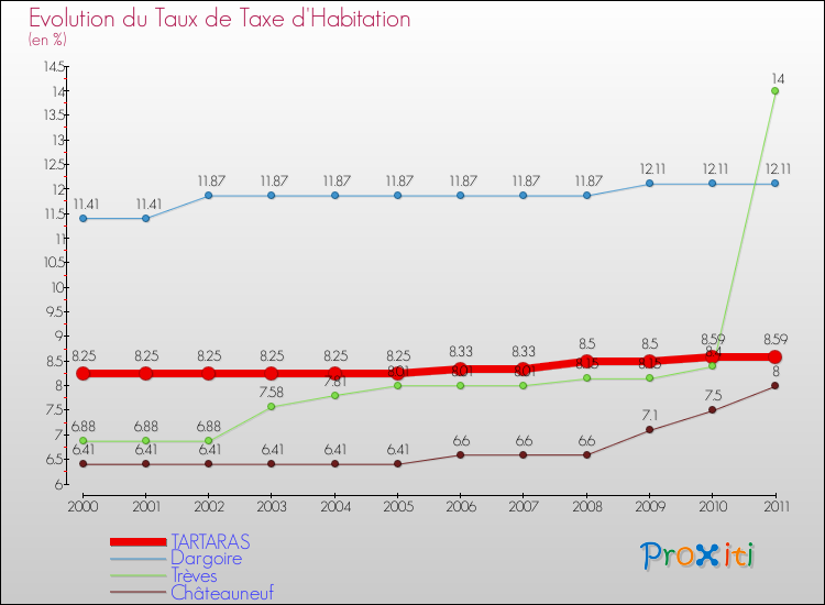 En 2011, le taux de la taxe d'habitation vôté par le conseil municipal de Tartaras était de : 8.59 %.