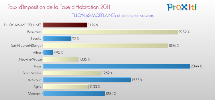 En 2011, le taux de la taxe d'habitation vôté par le conseil municipal de Tilloy-lès-Mofflaines était de : 11.19 %.