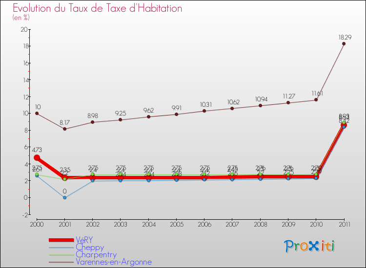 Pendant la même période, les communes françaises similaires à Véry, ont vu leur taux de taxe d'imposition baisser de 8.03 % en moyenne entre 2000 et 2010.