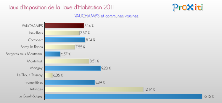 Vous trouverez ci-dessous des graphiques qui vous permettent de situer le taux de la taxe d'habitation de Vauchamps par rapport aux communes voisines.