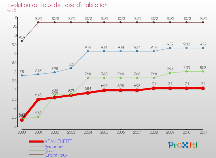 En 2011, le taux de la taxe d'habitation vôté par le conseil municipal de Veauchette était de : 7.1 %.