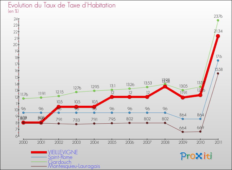 Le graphique ci dessous représente l'évolution du taux de la taxe d'habitation à Vieillevigne depuis 2000.