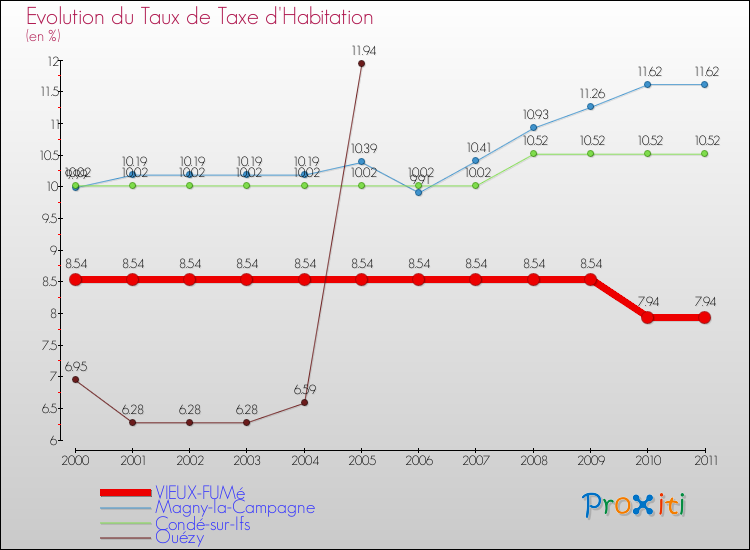 Pendant la même période, les communes françaises similaires à Vieux-Fumé, ont vu leur taux de taxe d'imposition augmenter de 21.67 % en moyenne entre 2000 et 2011.