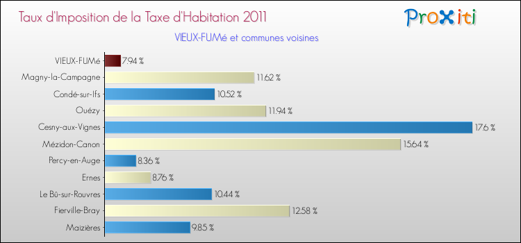 Vous trouverez ci-dessous des graphiques qui vous permettent de situer le taux de la taxe d'habitation de Vieux-Fumé par rapport aux communes voisines.