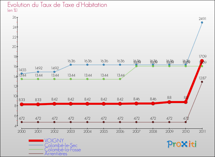 Le graphique ci dessous représente l'évolution du taux de la taxe d'habitation à Voigny depuis 2000.
