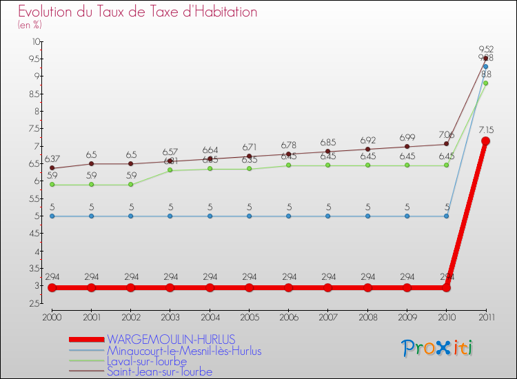 En 2011, le taux de la taxe d'habitation vôté par le conseil municipal de Wargemoulin-Hurlus était de : 7.15 %.