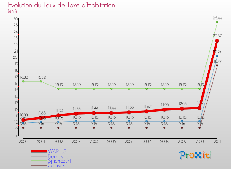 En 2011, le taux de la taxe d'habitation vôté par le conseil municipal de Warlus était de : 22.57 %.