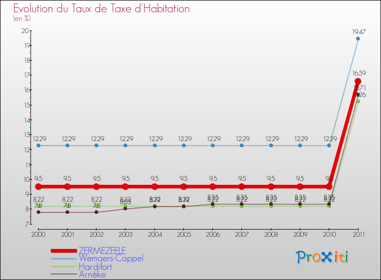 Le graphique ci dessous représente l'évolution du taux de la taxe d'habitation à Zermezeele depuis 2000.
