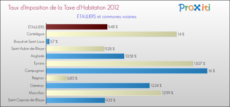 En 2012, le taux de la taxe d'habitation vôté par le conseil municipal de Étauliers était de : 9.48 %.