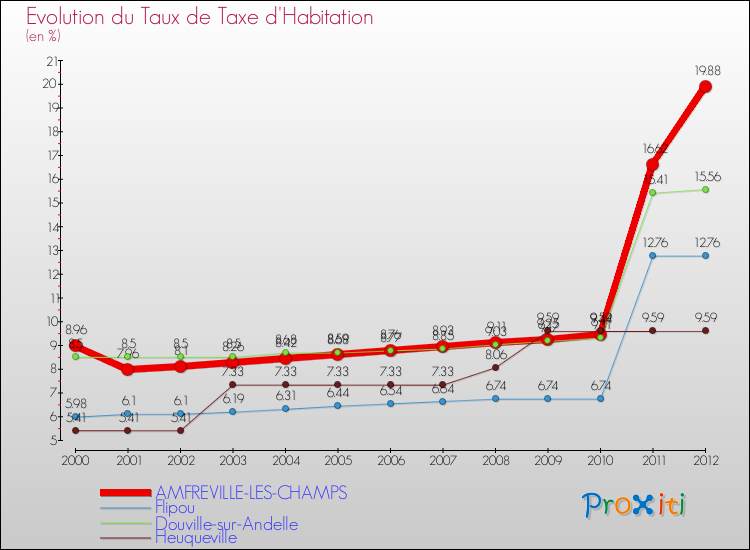 Pendant la même période, les communes françaises similaires à Amfreville-les-Champs, ont vu leur taux de taxe d'habitation augmenter de 113.2 % en moyenne entre 2000 et 2012.
