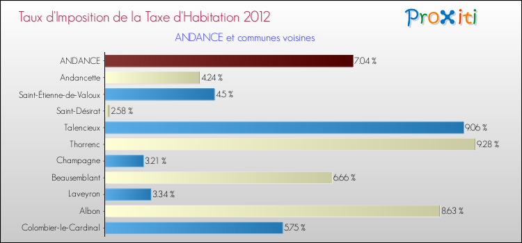 En 2012, le taux de la taxe d'habitation vôté par le conseil municipal de Andance était de : 7.04 %.