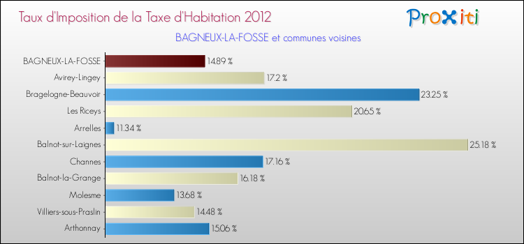 En 2012, le taux de la taxe d'habitation vôté par le conseil municipal de Bagneux-la-Fosse était de : 14.89 %.