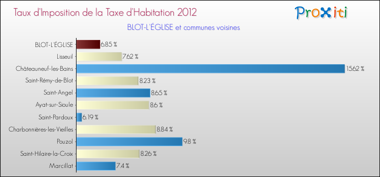 Vous trouverez ci-dessous des graphiques qui vous permettent de situer le taux de la taxe d'habitation de Blot-l'Église par rapport aux communes voisines.