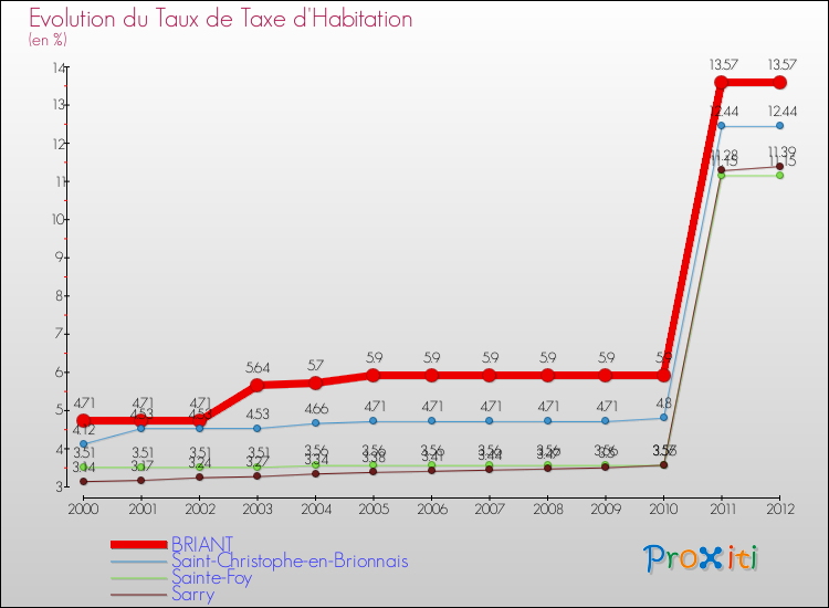 Pendant la même période, les communes françaises similaires à Briant, ont vu leur taux de taxe d'habitation augmenter de 105.86 % en moyenne entre 2000 et 2012.
