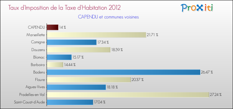 En 2012, le taux de la taxe d'habitation vôté par le conseil municipal de Capendu était de : 14 %.