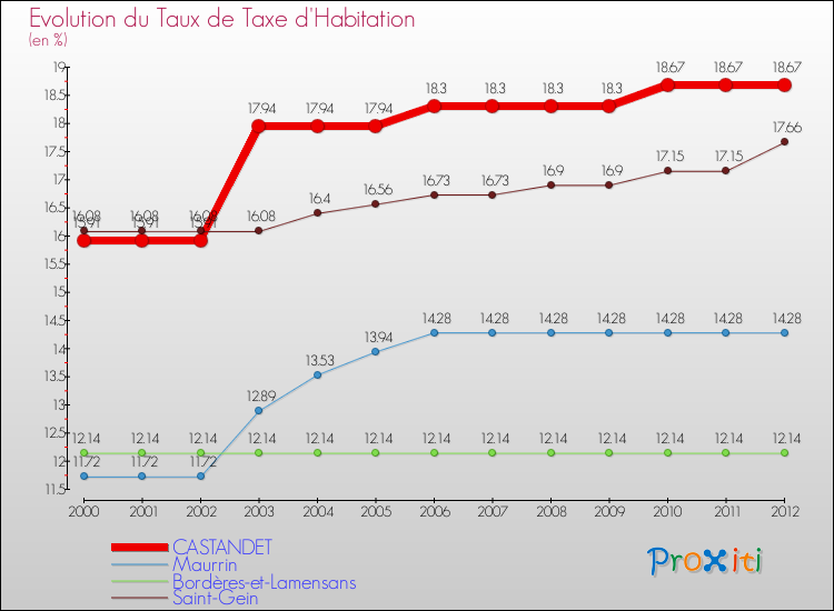 A Castandet, le taux de taxe d'habitation a ainsi augmenté de 17.35 % entre 2000 et 2012.