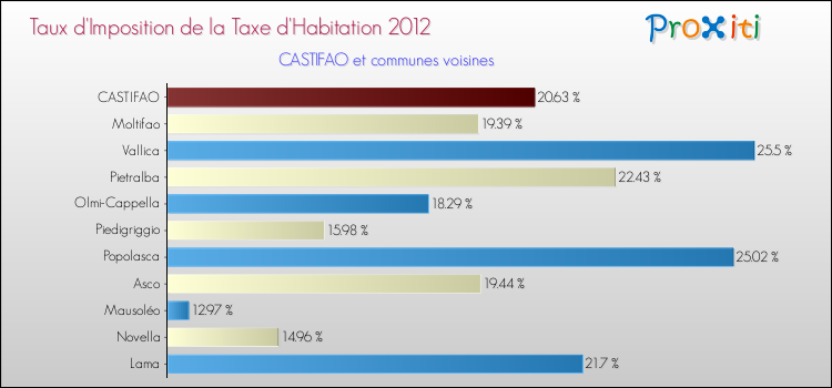 En 2012, le taux de la taxe d'habitation vôté par le conseil municipal de Castifao était de : 20.63 %.