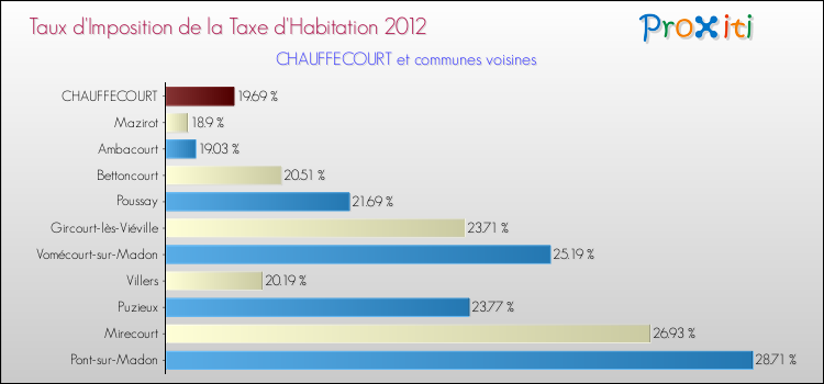 Vous trouverez ci-dessous des graphiques qui vous permettent de situer le taux de la taxe d'habitation de Chauffecourt par rapport aux communes voisines.