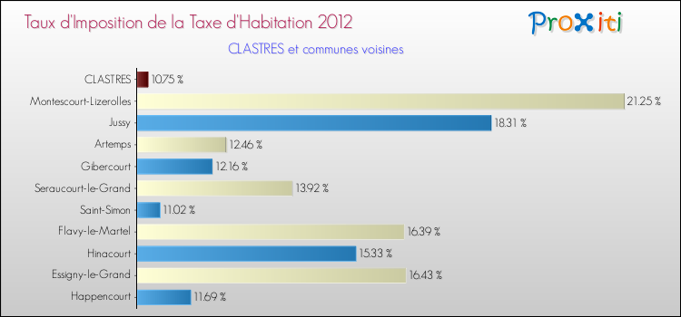 En 2012, le taux de la taxe d'habitation vôté par le conseil municipal de Clastres était de : 10.75 %.