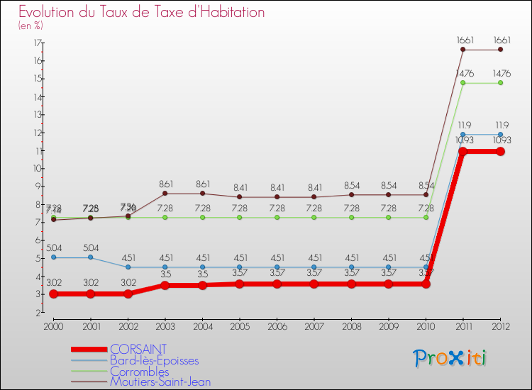 A Corsaint, le taux de taxe d'habitation a ainsi augmenté de 261.92 % entre 2000 et 2012.