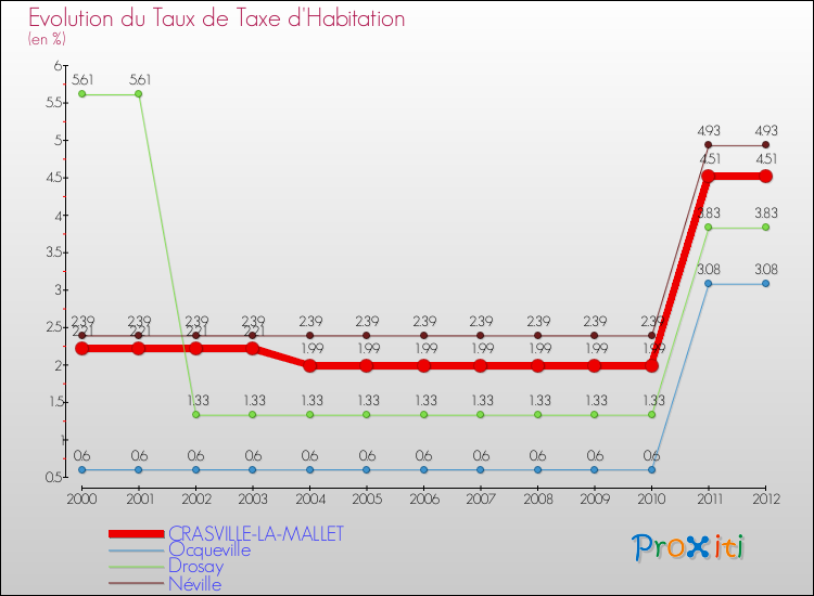 En 2012, le taux de la taxe d'habitation vôté par le conseil municipal de Crasville-la-Mallet était de : 4.51 %.