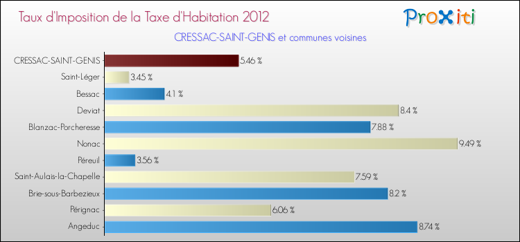 En 2012, le taux de la taxe d'habitation vôté par le conseil municipal de Cressac-Saint-Genis était de : 5.46 %.
