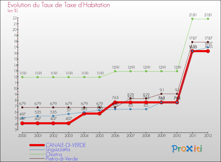 A Canale-di-Verde, le taux de taxe d'habitation a ainsi augmenté de 301.72 % entre 2000 et 2012.