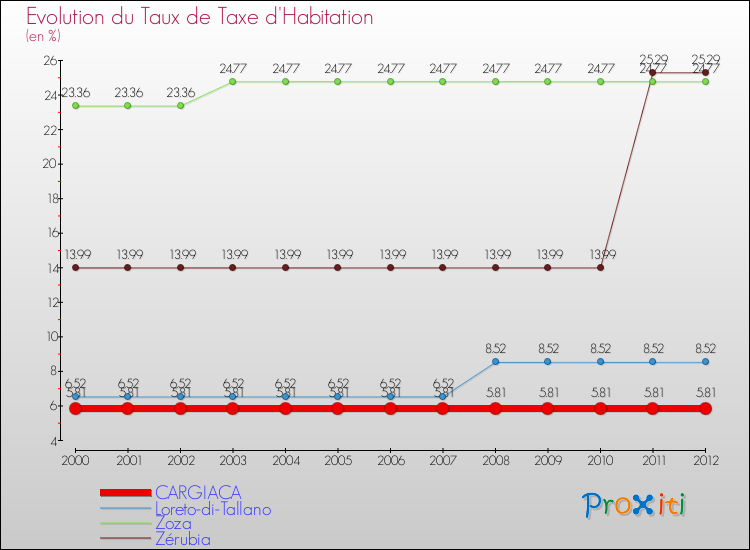 A Cargiaca, le taux de taxe d'habitation a ainsi augmenté de 0 % entre 2000 et 2012.