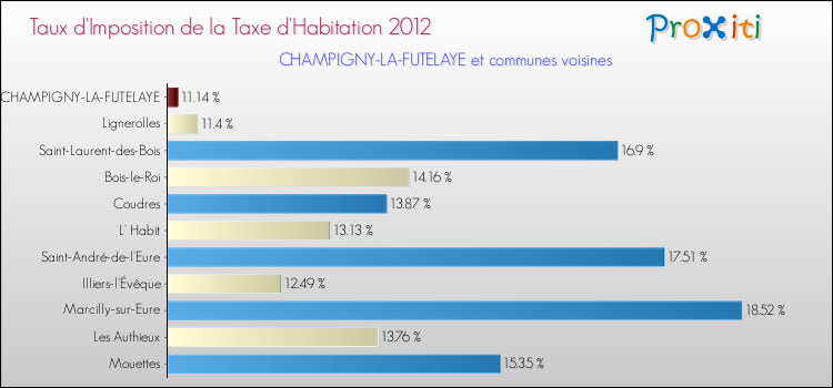 En 2012, le taux de la taxe d'habitation vôté par le conseil municipal de Champigny-la-Futelaye était de : 11.14 %.