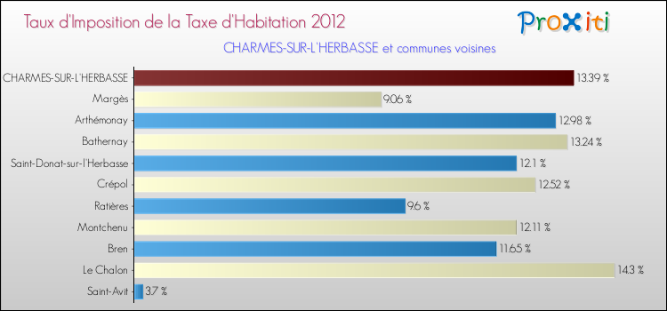 En 2012, le taux de la taxe d'habitation vôté par le conseil municipal de Charmes-sur-l'Herbasse était de : 13.39 %.