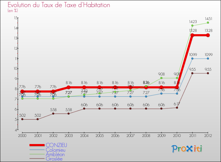 A Conzieu, le taux de taxe d'habitation a ainsi augmenté de 71.13 % entre 2000 et 2012.