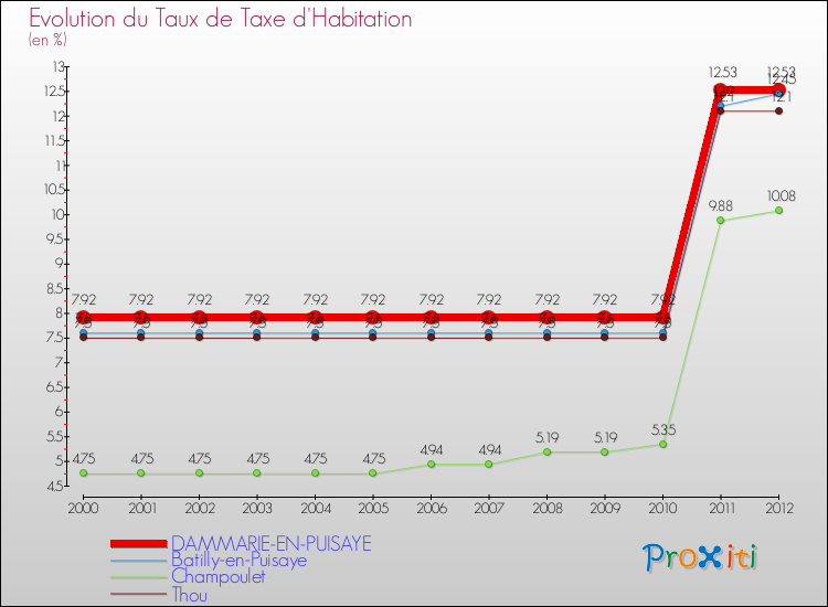 Pendant la même période, les communes françaises similaires à Dammarie-en-Puisaye, ont vu leur taux de taxe d'habitation augmenter de 105.86 % en moyenne entre 2000 et 2012.