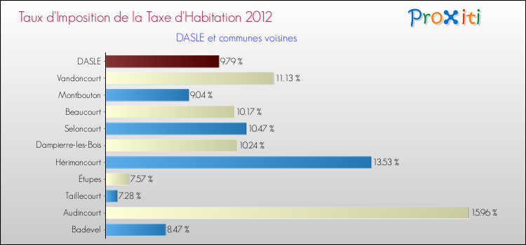 En 2012, le taux de la taxe d'habitation vôté par le conseil municipal de Dasle était de : 9.79 %.